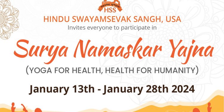 Hindu Swayamsevak Sangh (HSS) announces the seventeenth annual “Yoga for Health, Health for Humanity Yogathon” or “Surya Namaskar Yajna” (SNY). This program runs from January 13th to January 28th, 2024. Participants across all ages, genders, races, ethnicities, nationalities, and faiths are invited to participate in the Yogathon to kickstart the New Year with health awareness and practice.