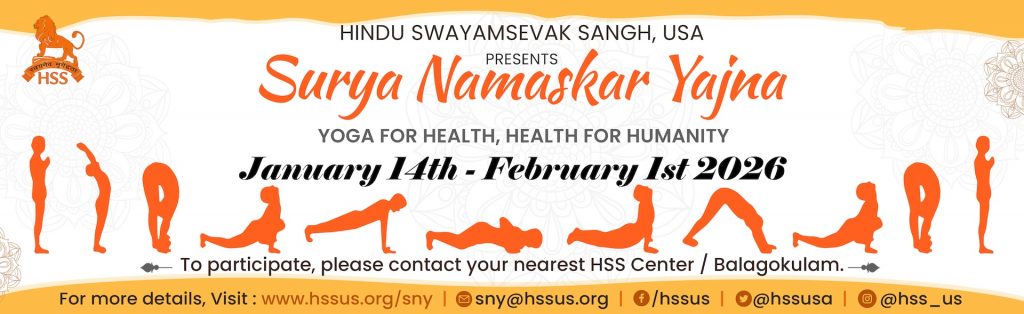 Hindu Swayamsevak Sangh USA (HSS) announces the nineteenth annual “Yoga for Health, Health for Humanity Yogathon” or “Surya Namaskar Yajna” (SNY). This program runs from January 14th to February 1st, 2026. Participants across all ages, genders, races, ethnicities, nationalities, and faiths are invited to participate in the Yogathon to kickstart the New Year with health awareness and practice.